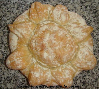 Leudar hasta que doble su volumen y dar forma de sol en la bandeja espolvoreada con la harina, (también se puede dar forma de hogaza y hacerle unos cortes yo quise probar de esta manera), dejar que doble su volumen en un lugar calido y al abrigo de aire.