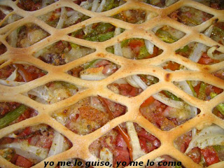 Extenderle el tomate después el queso mozarella, el jamón york, champiñones, aceitunas, pimiento, cebolla, orégano, albahaca y el queso de oveja. Con un rodillo hacer un rectángulo de 5 Mm. de grosor y pasarle un rodillo de rejilla y pégalo por los bordes de la pizza y sellarla como veis en la fotografía (si no tenéis rodillo, hacer tiras y entrecruzarlas).