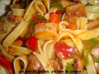 En olla poner a hervir 2 litros de agua cuando empiece a hervir añadir sal, un chorrito de aceite y los tallarines, cocer el tiempo recomendado por el fabricante escurrir y añadir al sofrito mezclar y servir.