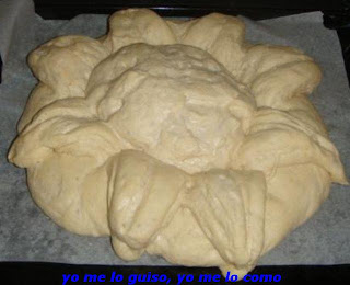 Leudar hasta que doble su volumen y dar forma de sol en la bandeja espolvoreada con la harina, (también se puede dar forma de hogaza y hacerle unos cortes yo quise probar de esta manera), dejar que doble su volumen en un lugar calido y al abrigo de aire.