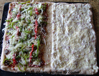 Extender en la otra mitad en este orden tomate, mozzrella, jamón de york, champiñones, jamón de york, aceitunas, cebolla, pimiento, aceite de oliva, pimienta negra y por ultimo queso rallado.