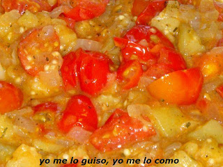 En una sartén honda añadir bastante aceite y calentar añadir la berenjena escurrida y freír unos minutos a continuación añadir la cebolla, rehogar unos 5 ó 10 minutos, cuando este todo pochado escurrir el aceite sobrante y añadir los tomates cherrys, sal, tomillo, albahaca y orégano dejar a fuego medio hasta que este todo frito.