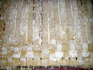Colocar una tira en forma horizontal, de la otra masa que tenemos reservada. Volver a poner las tiras en su sitio.