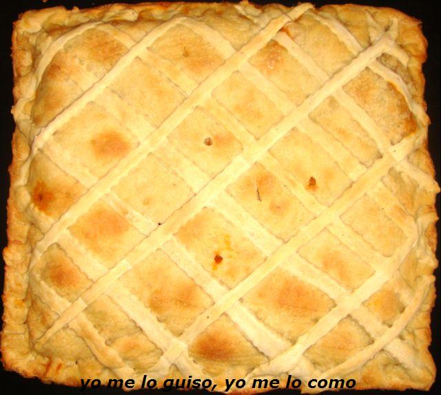 Estirar la otra mitad dándole la misma forma y proporción, (yo la estiro en film transparente es mas fácil de manejar, para montarla encima de la mitad rellena) pitar con huevo batido el borde de la que esta rellena y montar encima la segunda mitad sellando con un tenedor o cuchillo. Pitar toda la superficie con huevo batido. Se puede guardar una parte de masa para decorar.