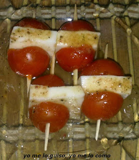 Partir los tomates por la mitad, con un palillo enlazar los tomates alternándolos con la leche cuajada y bañarlos con el aceite de anchoas y albahaca.