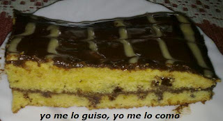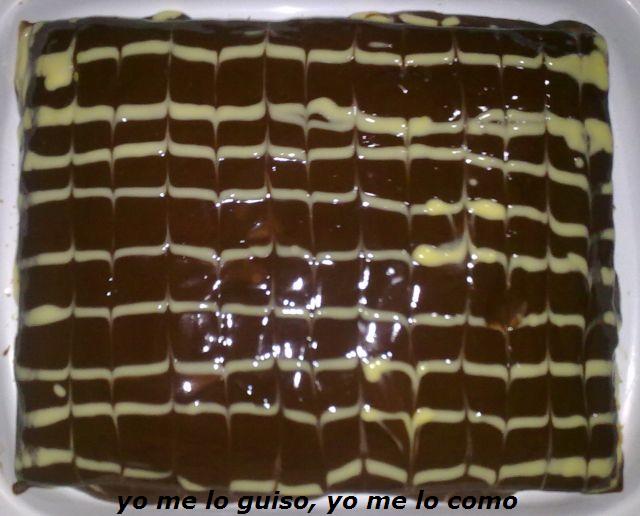 En una bandeja poner la mitad del bizcocho, emborráchalo con el almíbar y extender un poco de cobertura de chocolate, emborrachar la otra mitad y cubrir con la cobertura de chocolate.