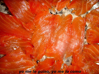 En un recipiente hondo hacer una cama con la mezcla poner los lomos de salmón con la piel hacia abajo volver a poner la mezcla y después el salmón esta vez con la piel hacia arriba. Terminar de cubrir con la mezcla.