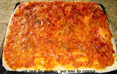 la bandeja del horno con la masa. Extender la mezcla de tomate y salchichas.